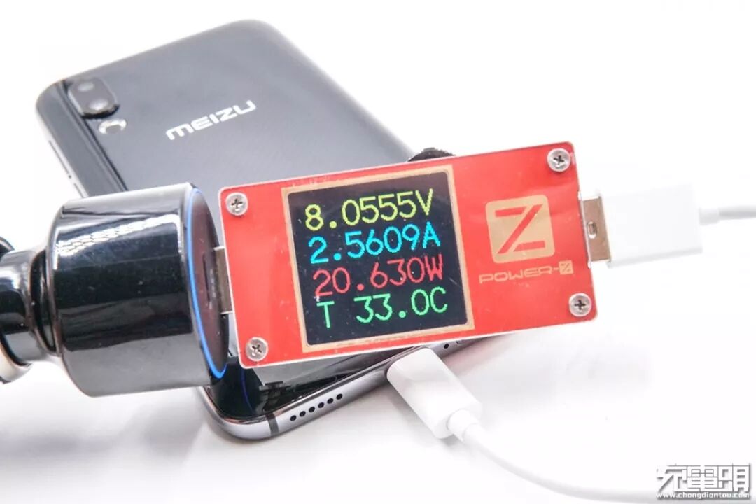 使用车充的USB-A接口对魅族16s进行充电,当前电压为8.05V,当前电流2.56A,功率显示20.63W,握手PE快充,达到了这款车充USB-A接口的最大输出功率。