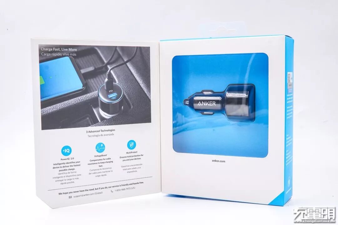 封面页通过磁力吸附,翻开就能看到一个巨大的橱窗,里面就是本次评测的主角——Anker PowerDrive Speed+ 2车充。封面的内页上描绘了产品的使用场景,同时也介绍了这款车充的三大特色:Power IQ 2.0快充,智能识别负载设备,匹配最快的充电方式;线损电压补偿功能,保持快充速度;多重防护,确保用户和设备的安全。