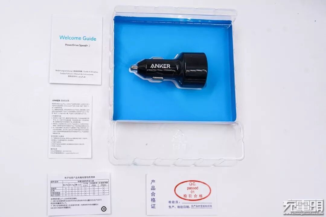 包装内部,车充本体装在两层透明保护壳中,附件有说明书、保修卡、合格证、有害物质清单。