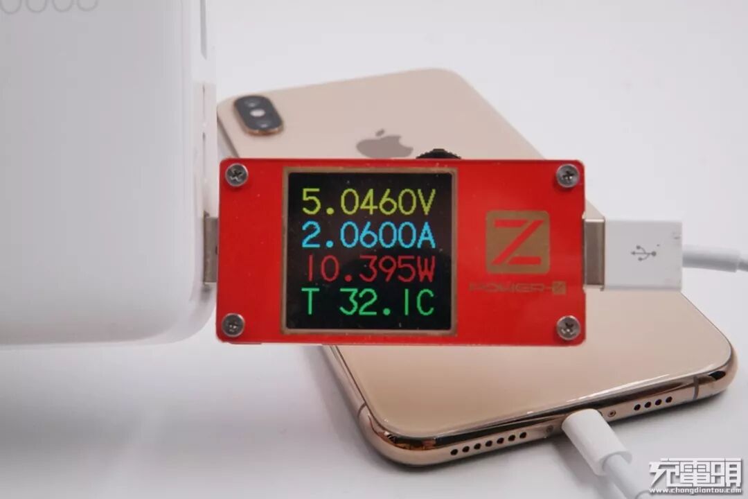 使用Redmi 充电宝快充版的OUT1接口充iPhone XS Max,电压5.04V,电流2.06A,功率10.39W,开启Apple2.1A协议充电。