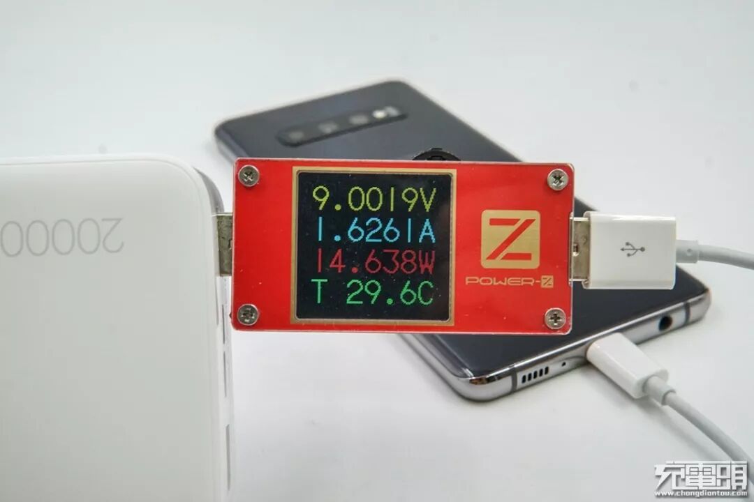 充三星S10+,电压9.00V,电流1.62A,功率14.63W,成功握手AFC快充。