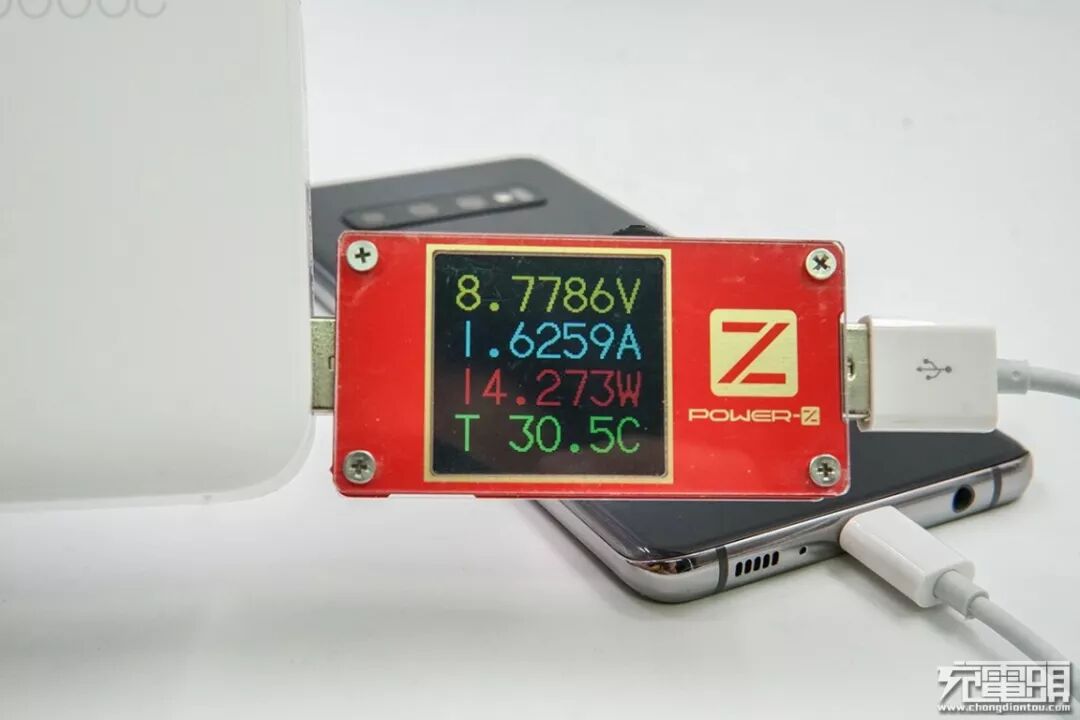 充三星S10+,电压8.77V,电流1.62A,功率14.27W,成功握手QC快充。