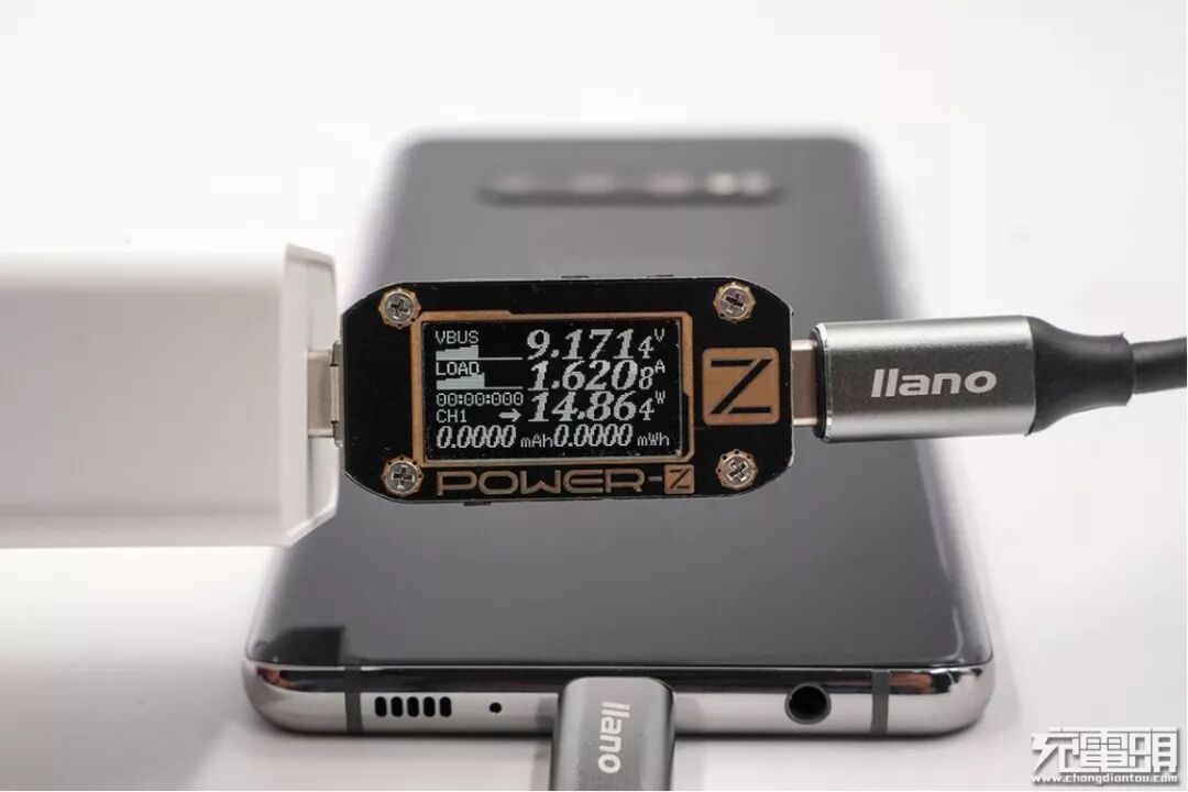 对三星S10+进行充电,当前电压为9.17V,电流1.62A,功率14.86W,开启PD快充。