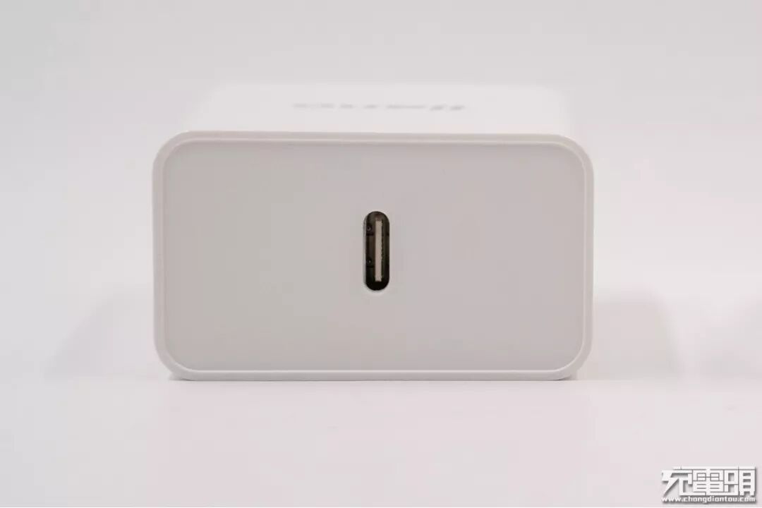 绿巨能18W PD充电器单USB-C接口设计,接口位于中心处。输出面磨砂处理,表面向下凹陷。