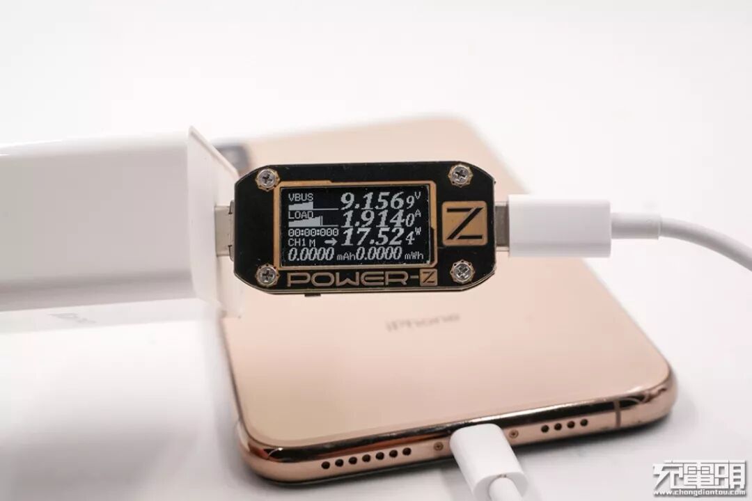 使用绿巨能18W PD充电器对iPhone XS Max进行充电,当前电压为9.15V,电流1.91A,功率17.52W,开启PD快充。