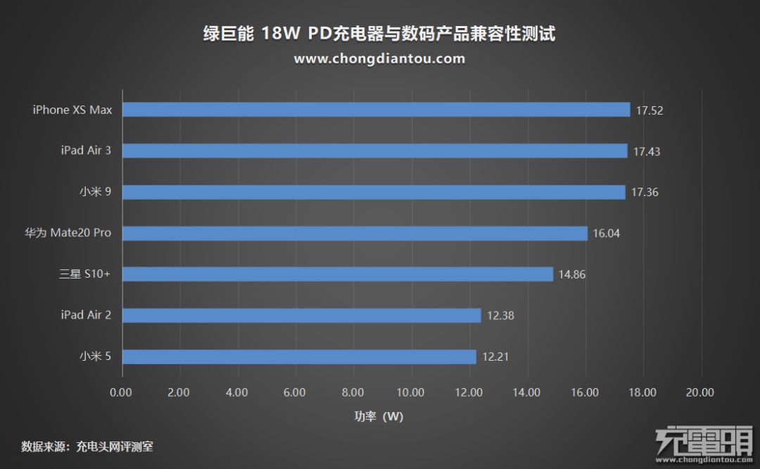 最后将绿巨能 18W PD充电器的数码产品兼容性数据做一个统计,这款充电器支持PD、QC充电协议,相应的设备都能准确握手PD快充,像iPad Air 2这种不支持PD的设备也能开启Apple 2.4A充电模式。