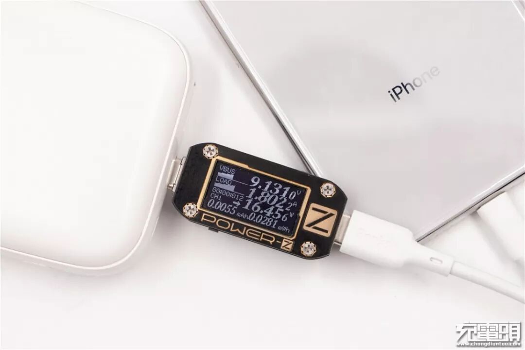 使用JDB移动电源USB-C口充iPhone X,电压9.13V,电流1.8A,功率16.45W,开启PD快充。