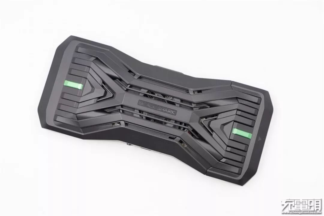 黑鲨极冷散热背夹外壳为塑料材质,黑色。外壳具有多条散热格栅,呈现“X”形状,中间黑鲨英文标识,两侧有绿色条纹装饰。