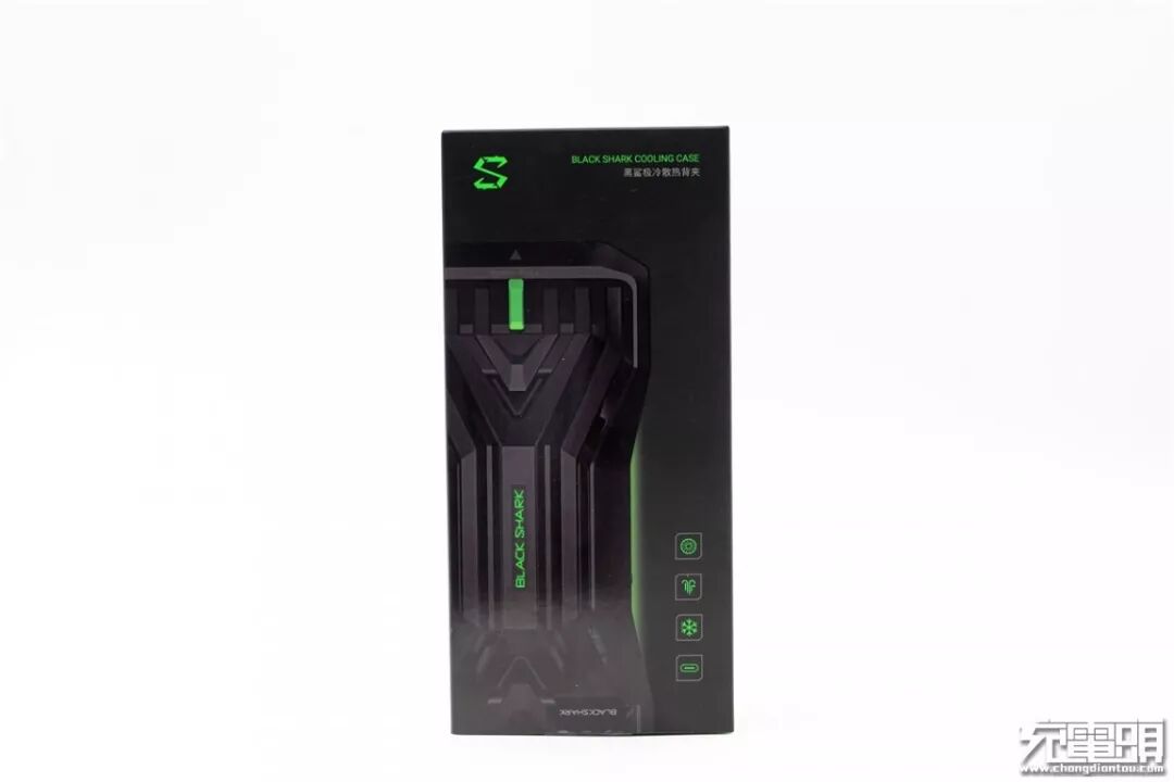 黑鲨极冷散热背夹包装盒采用黑绿配色,正面有黑鲨Logo、产品名称以及产品实图,产品实图采用UV覆膜工艺。