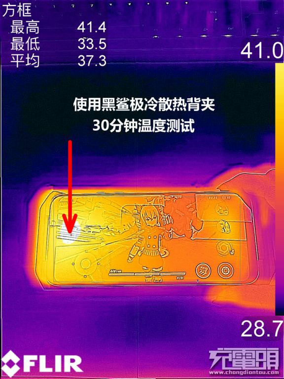 第二组数据小编为黑鲨手机装上黑鲨极冷散热背夹为其散热,并为背夹插上电源为手机充电,手机正面最高温度为41.4度,对比第一组裸机数据,使用黑鲨散热倍加有1.7度降温,虽然有效果但是并不明显。另外小编还测试了使用散热背夹时进行充电的情况,就不上图了,更加热。