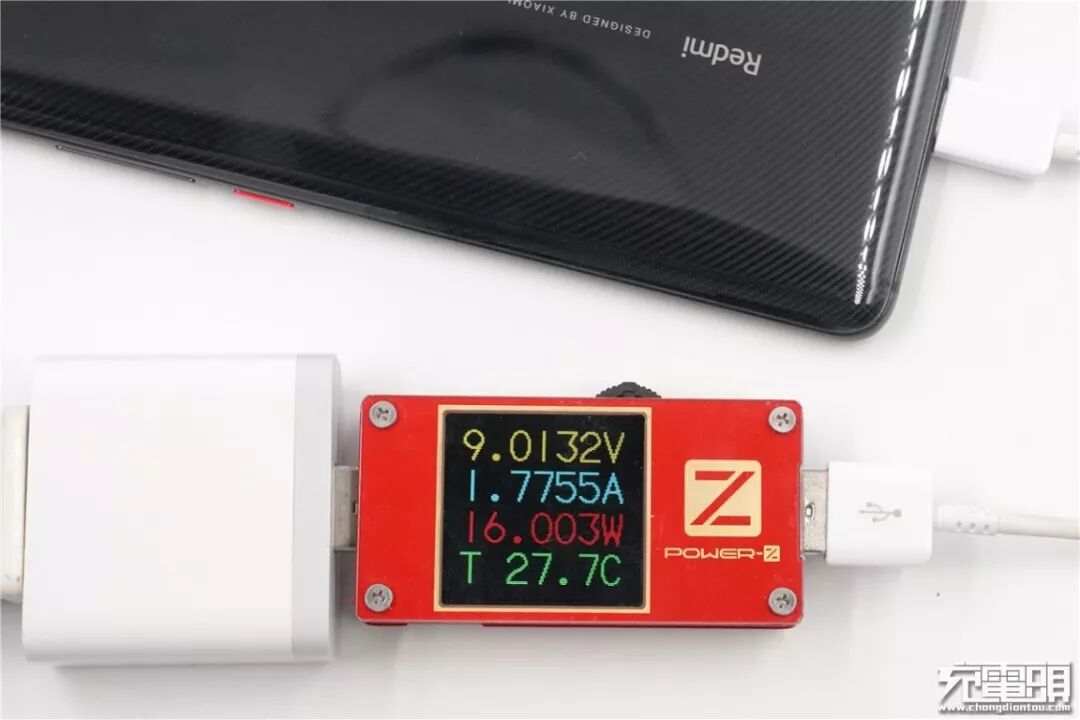 使用苹果18W PD充电器充Redmi K20 Pro,电压9.03V,电流1.77A,功率16.01W,开启PD快充。