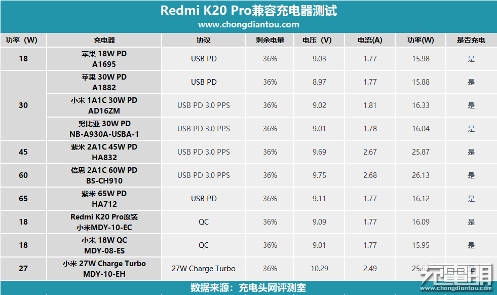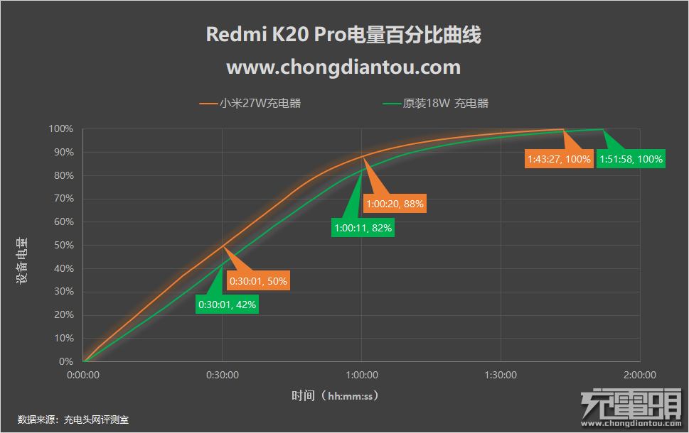 使用原装18W QC充电器为Redmi K20 Pro全程充电,半小时充入电量42%,1小时充入量82%,全程耗时1小时52分。使用小米27W Charge Turbo充电器为其全程充电,半小时充入电量50%,1小时充入电量88%,全程耗时1小时43分。27W充电时大功率维持时间的长短,与室温、机器温升有直接关系,如果用户所处地室温较高的话,27W充电效果与18W充电效果拉不开大差距。Redmi K20 Pro采用了弹出式前置摄像头设计,正面做到了“真”全面屏设计,无刘海、无水滴,带来了更好的视觉效果。后置4800万AI三摄,40000mAh大容量电池,硬件均是旗舰水准,圆弧背面带来的手感也十分不错。Redmi K20 Pro支持PD、QC和27W Charge Turbo三种快充,普通PD、QC快充功率大概在16W左右,27W Charge Turbo最高可达25W。全程充电测试方面,使用小米27W Charge Turbo充电器半小时充入电量50%,1小时充入电量88%,全程耗时1小时43分。原装18W QC充电器,半小时充入电量42%,1小时充入量82%,全程耗时1小时52分。Redmi K20 Pro 原机包装内配送的是QC3.0 18W USB-A口充电器,想要体验27W Charge Turbo快充的话需要额外付费购买充电器,测试结果27W充电器与18W充电器相比,充电速度有提升,但效果不是很明显。27W Charge Turbo充电器最大的特点“QC Calss B 20V”,是用来给对小米20W无线充电器握手用的,Redmi K20 Pro并不带无线充电功能这有点尴尬。充其他设备只是一个普通的QC3.0充电器,通用性不高。如果你问小编,27W充电器值不值得买,新机加20元的价格还是值得入手的,性价比不错,能快一点就是一点不是么。但非购机套装的话,后期独立购买27W充电器要49元,性价比有点低。另外Redmi K20 Pro 也支持一部分PD PPS充电器触发27W充电效果,PD充电器通用性更强,设备支持更多,购买支持K20 Pro 27W充电效果的PD PPS充电器是一个不错的选择。扫描或长按上方二维码免费报名参与