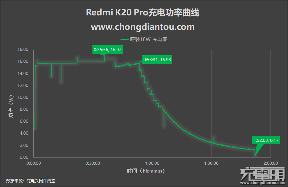 使用原装18W QC充电器为Redmi K20 Pro全程充电,功率变化曲线大致分为两部分。53分钟前持续大功率输出,全程最高功率16.97W;53分钟后功率开始逐渐下降。全程耗时1小时52分钟。