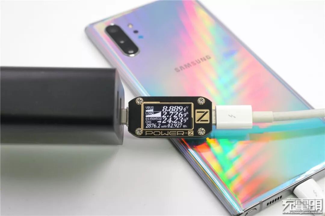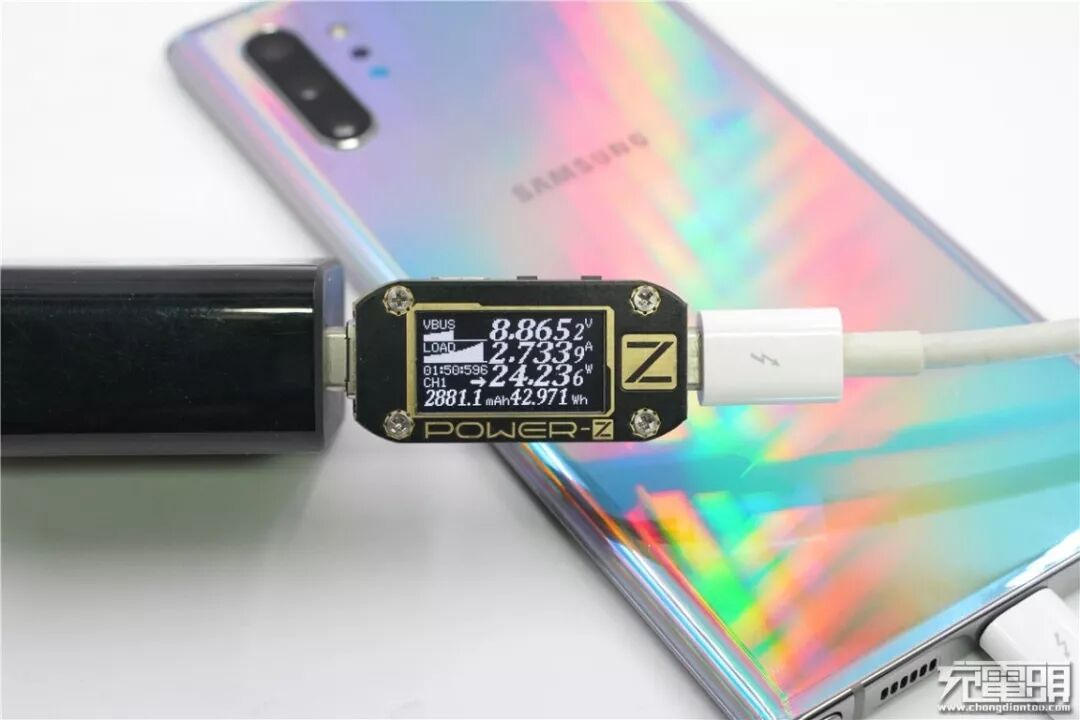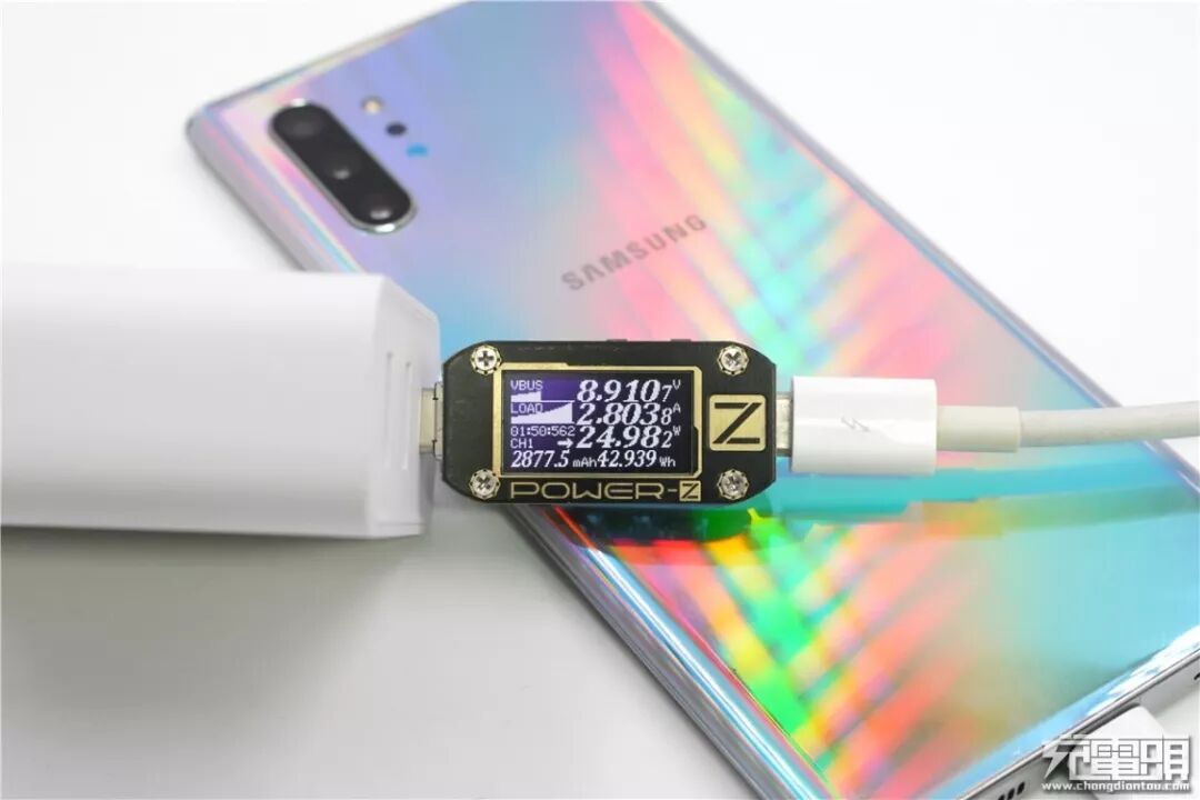 使用POWER-Z读取PDO报文,发现他除了支持5V3A / 9V3A /12V3A / 15V3A / 20V2.25A这几个常规固定电压档外,还带有一组特殊的PPS。PPS信息如下:4.4-11.0V/4.0A,PPS档位电流达到4A,PPS功率最大44W,比我们常见的PPS充电器的PPS档位功率都要大,也就是说该充电器拥有 Note10+ 45W 快充模式的钥匙。这应该是市面上第一台支持 Note10+ 45W快充协议的移动电源。作为旗舰级产品,三星Note10+在设计、做工、用料方面都属于第一梯队,它采用的是骁龙855处理器,玩游戏、看4K电影都不在话下。搭载6.8英寸的动态AMOLED显示屏,显示效果通透细腻。唯一美中不足的是显示屏上方中央挖了个缺口,在一些人眼里可能接受不了这种设计,但这也是为了做成全面屏而不舍弃前置摄像头所妥协的一种选择,萝卜白菜各有所爱。充电性能方面,三星Note10+采用了USB-C接口,支持PD 3.0 PPS快充,最大支持45W快充,在实际测试中,最高功率可达36W+。在兼容性测试中,小编发现使用支持PPS快充协议的充电器为它充电将会有好几种情况:第一种:有PPS功能,有9V3A,实际充电功率24W+;(Note10+ 25W快充模式)