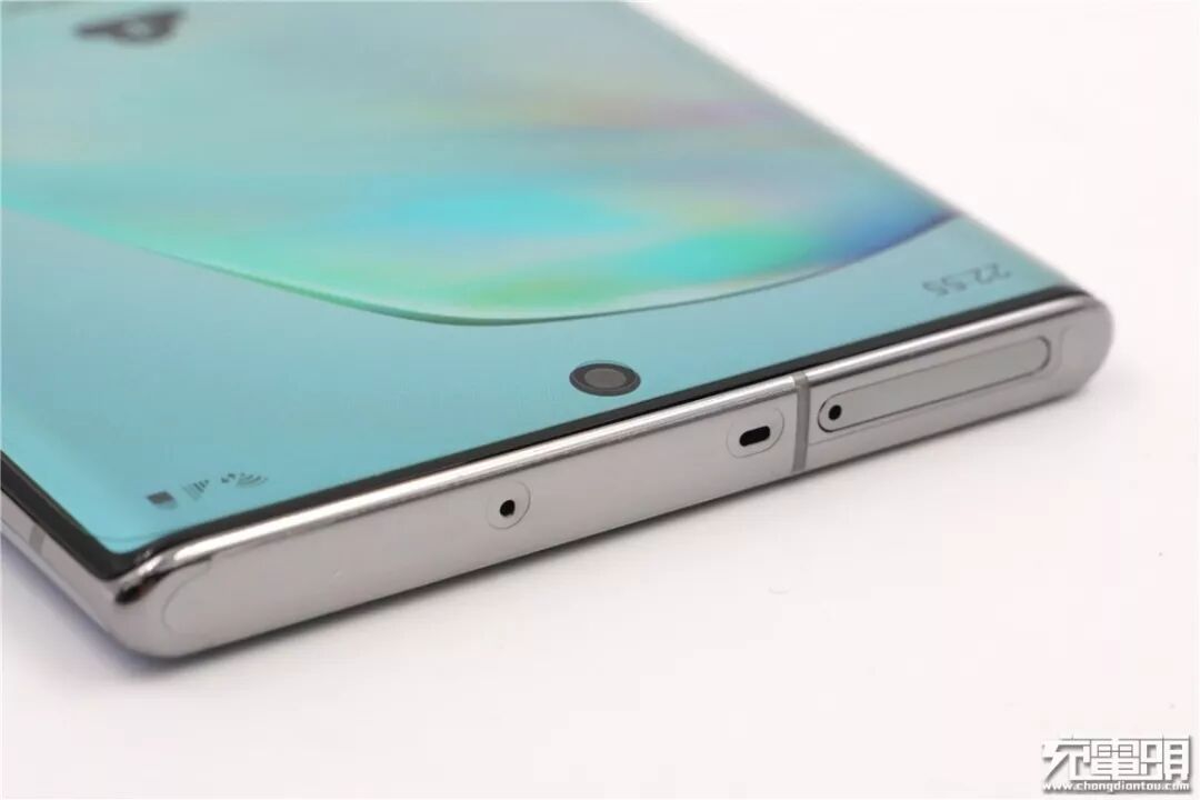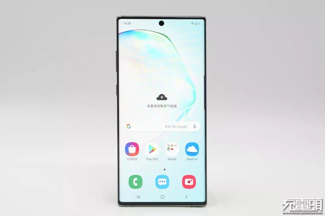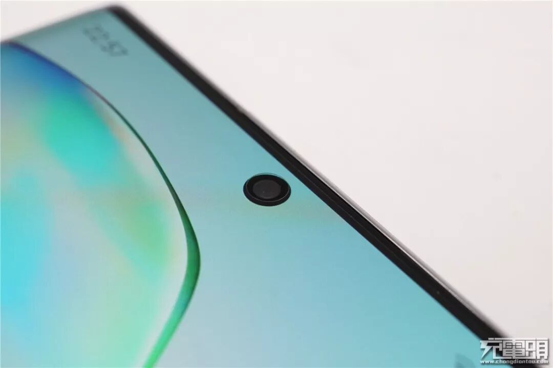 三星Note10+正面采用了6.8英寸的动态AMOLED显示屏,分辨率为3040 x 1440,内置屏幕超声波指纹识别。为了做到极致屏占比,Note10+采用了“挖孔屏”方案,在屏幕上方左右居中位置有一个小圆孔,这也是前置摄像头所在位置。