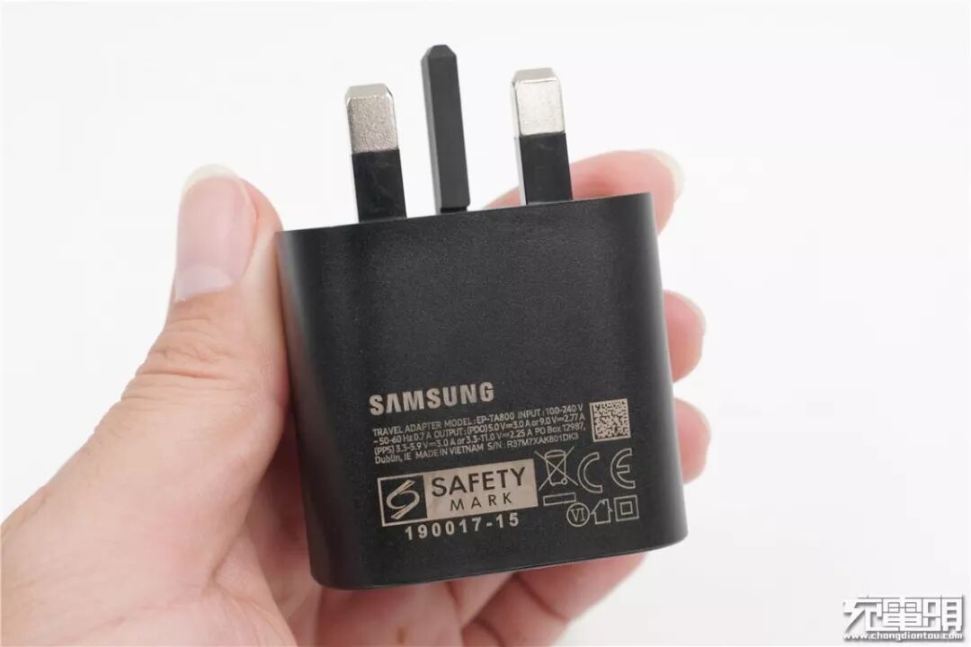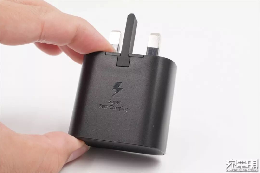小编手上这台三星Note10+为港版,标配了一枚英规插脚充电器,颜色为黑色,正面凹印一道闪电图案与“Super Fast Charging”字样。