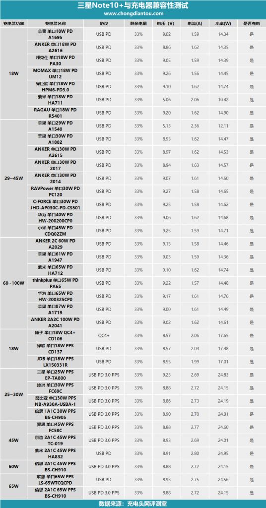 三星Note10+的兼容性测试,小编共找来了36款充电器,这些充电器有些支持PD快充,有些支持PD 3.0 PPS快充,涵盖了18W~100W功率不等,它们会与Note10+擦出怎样的火花呢?