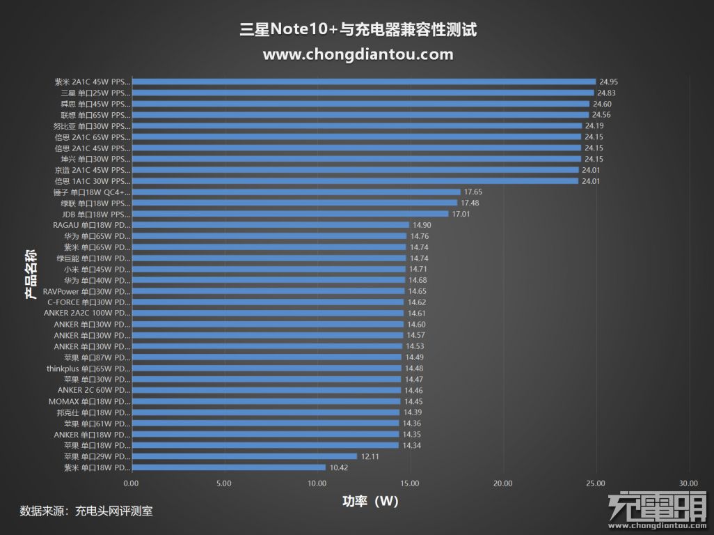这么多款充电器测试下来,三星Note10+功率平台有四种:25W、18W、15W、10W左右。给Note10+充电可达到近25W、近18W的充电器它们有一个共同特征:都是PPS充电(支持PD 3.0 PPS快充协议),其中功率大于或等于25W的PPS充电器功率可以达到25W充电功率,而功率在18W的PPS充电器为Note10+充电功率被限制在17W左右。测试中不支持PPS的PD充电器无论它的功率有多大,功率始终被限制在15W左右,普遍为14W+。另外,如果PD充电器对Note10+兼容性欠佳或者自身档位缺失握手5V输出,功率将会在10W左右。说好的45W快充呢?这么多充电器,甚至有100W功率的性能怪兽都无法给它开启,难道第三方真的不能兼容吗?