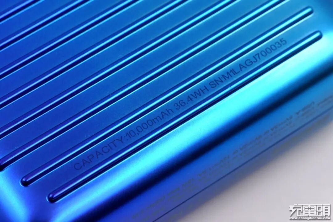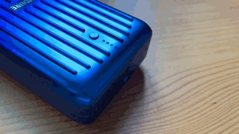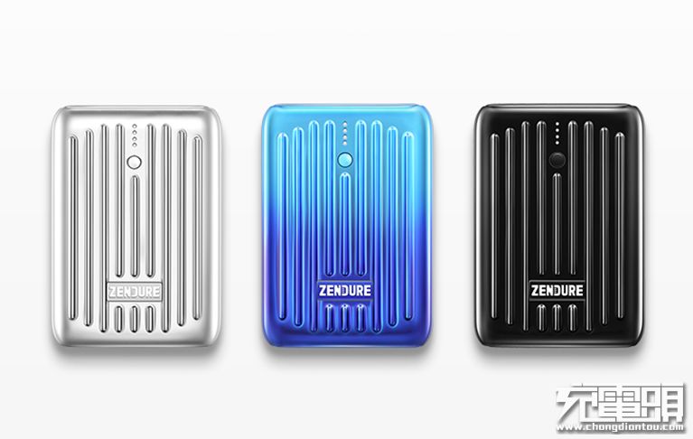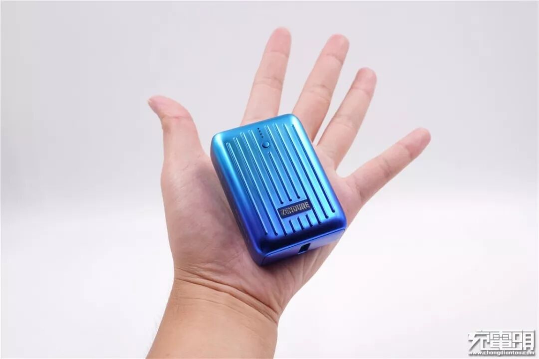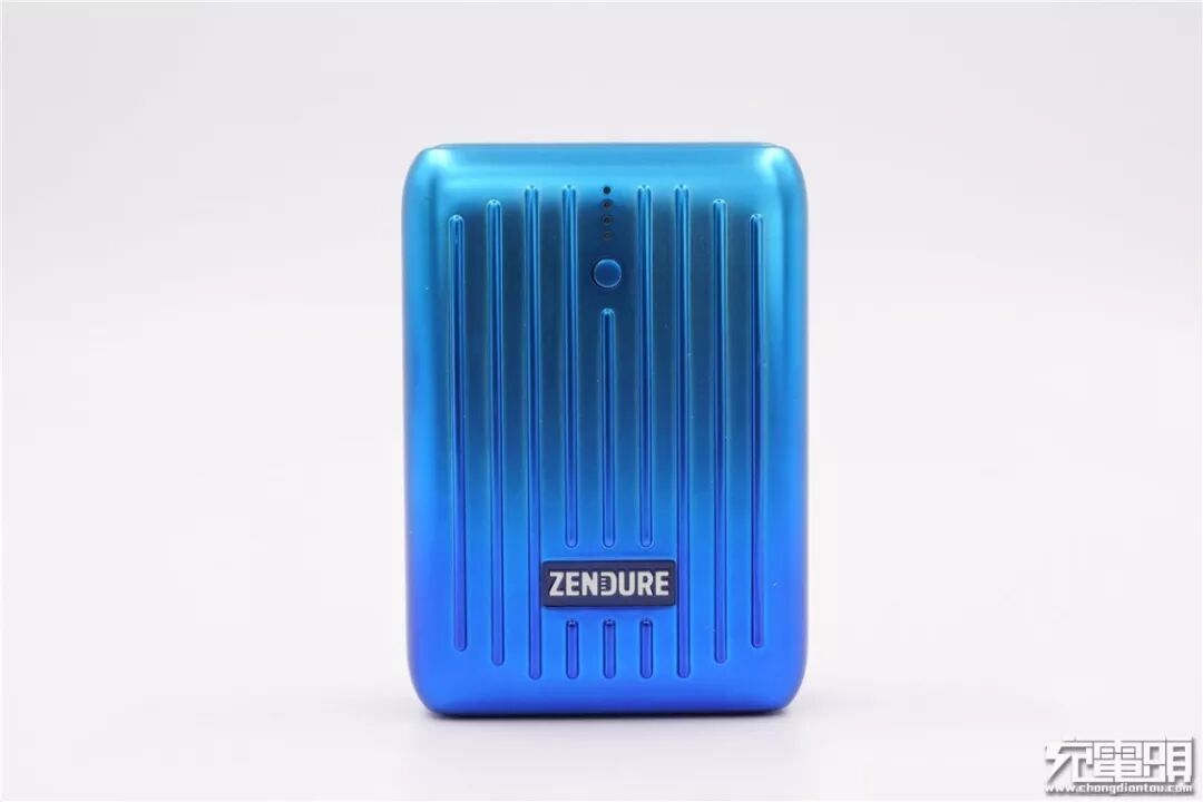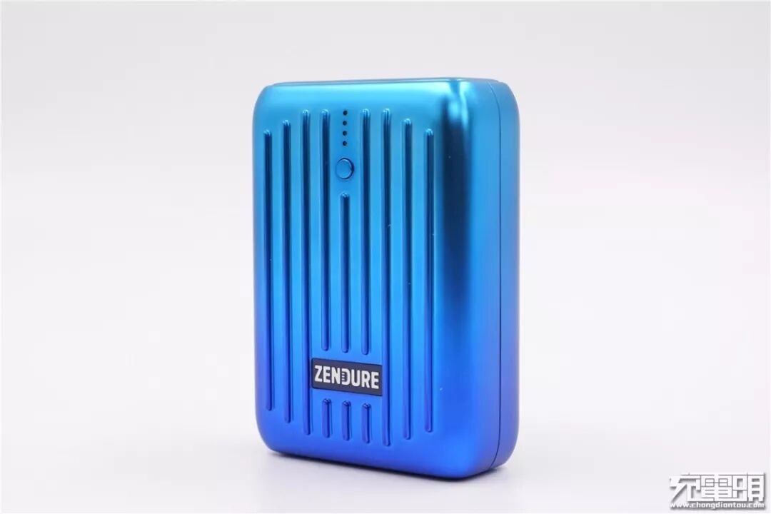 ZENDURE移动电源的辨识度非常高,外形统一采用了“旅行箱”设计,SuperMini也不例外。SuperMini整体呈长方体,壳体采用工程塑料材质,前后两面均有突出竖条纹理,外观非常像旅行箱。最惊艳的还是移动电源表面那层青蓝渐变电镀工艺,金属质感十足,非常符合当现代人的审美理念。