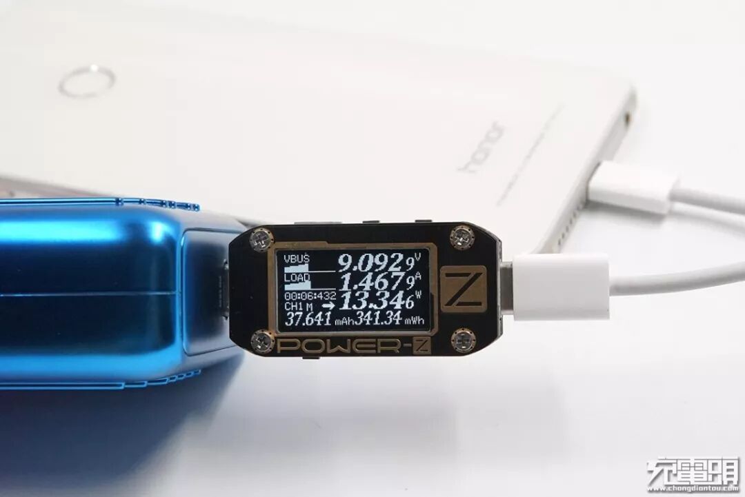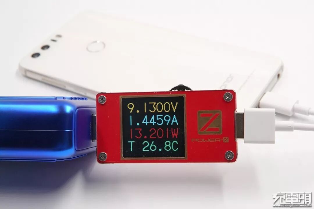 充荣耀8,电压9.09V,电流1.46A,功率13.34W,开启FCP快充,ZENDURE SuperMini USB-C口还支持FCP快充。