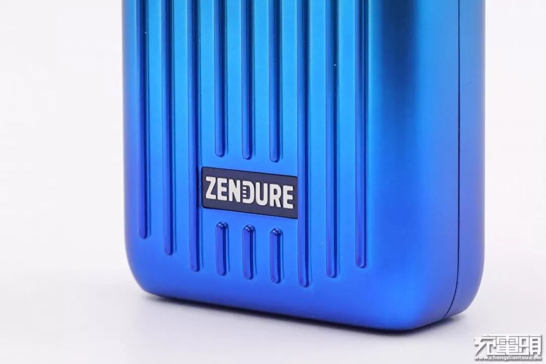 ZENDURE牌Logo特写。银色文字为抛光面,深蓝色打底为磨砂面,再加上整个移动电源机身的青蓝渐变电镀显得非常时尚。