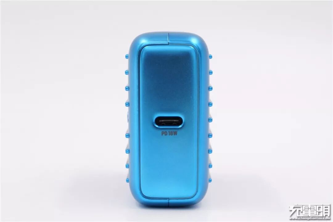 与USB-A接口对立一面是移动电源的IUSB-C接口,具备输入、输出双快充功能,接口下方标注“PD 18W”字样,意为该接口支持PD快充,最大功率18W。