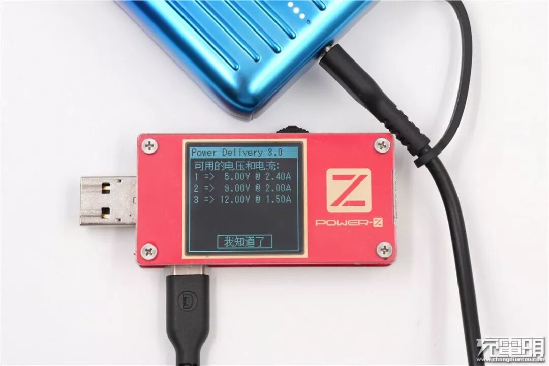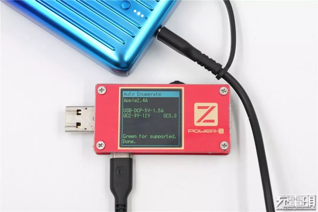 使用ChargerLAB Power-Z KT001对移动电源USB-A口进行协议检测,支持Apple 2.4A、DCP协议,以及QC 2.0、QC 3.0快充协议。