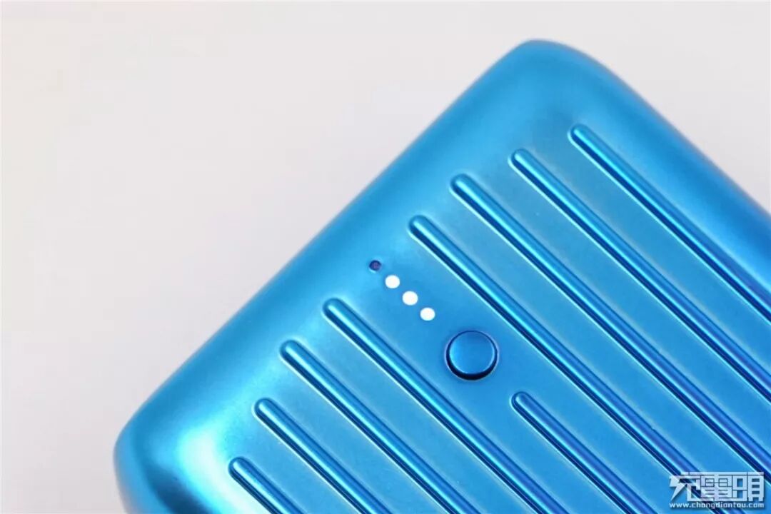 电源按钮特写。圆钮凸出高度略低于竖条纹理,减少了放在包中被误按的可能。按下电量显示激活按键,指示灯亮起,发出白色光源。SuperMini还支持小电流输出模式,双击电源键即可开启(开启后指示灯依次轮回闪烁跑马灯效果),手环手表耳机等小电流设备也安心充。