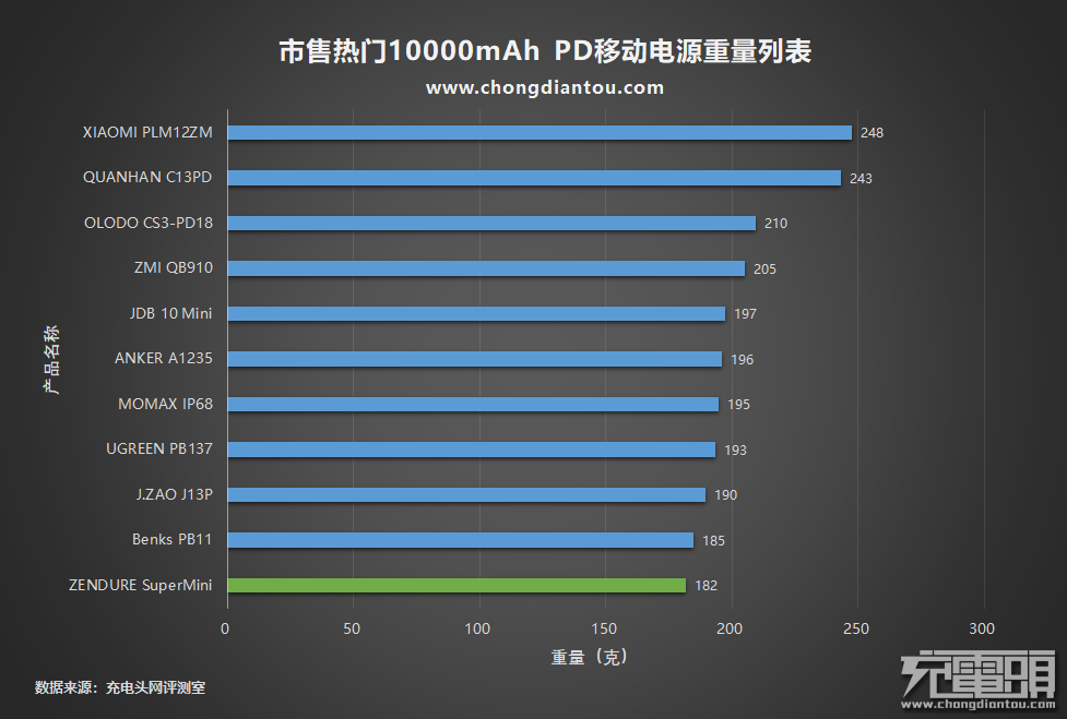 在市售热门10000mAh PD移动电源中,ZENDURE SuperMini重量最轻,出行携带压力最小。