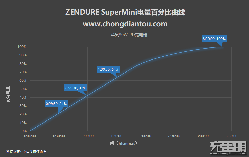 接下来我们来看看ZENDURE SuperMini从0%电量充至100%电量需要花多长时间,小编采用苹果30W PD充电器作为供电端,通过ChargerLAB Power-Z KM001测试仪进行上位机监测纪录数据,制成如下表格: