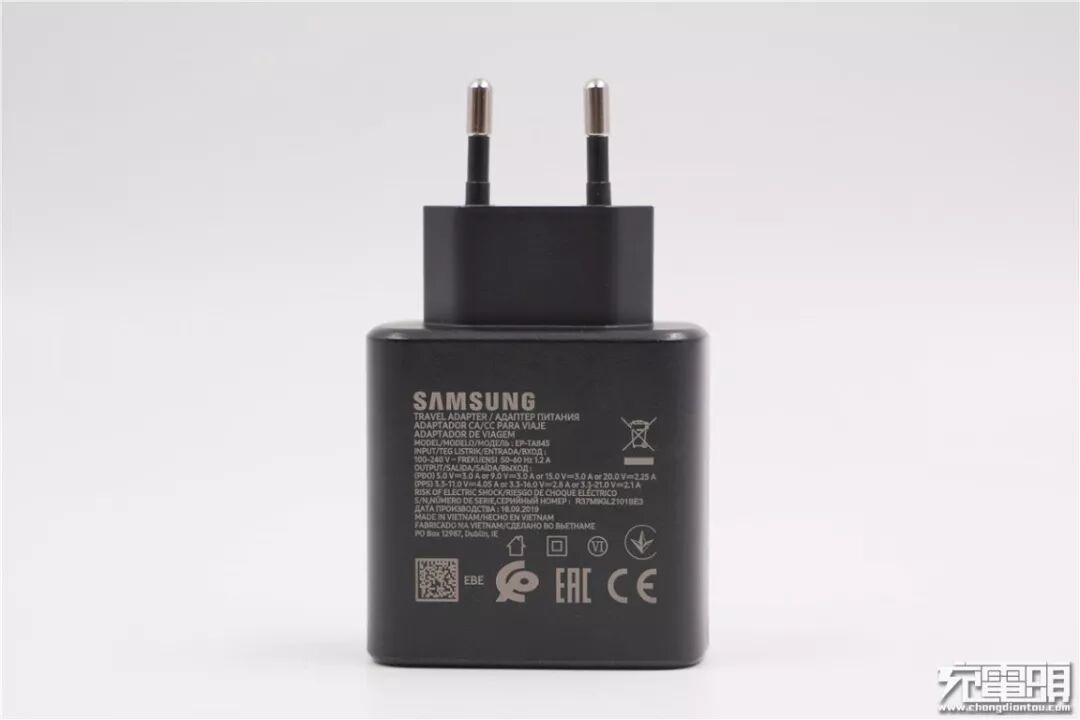 三星这款45W快速充电器具有黑、白两种配色,这次为大家测试的是黑色款式。充电器使用塑料外壳,造型方正,表面哑光磨砂处理,正面刻有一道闪电标志以及Super Fast Charging字样,标志与字样皆为亮面材质,显眼突出。我们手上这枚充电是是欧规的插脚,可以看到上部凸出了一大块。