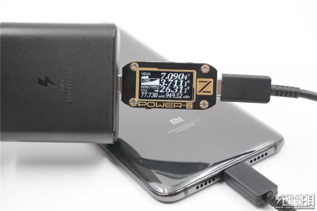 充小米9,电压7.09V,电流3.71A,功率26.31W,顺利开启Charge Turbo快充。