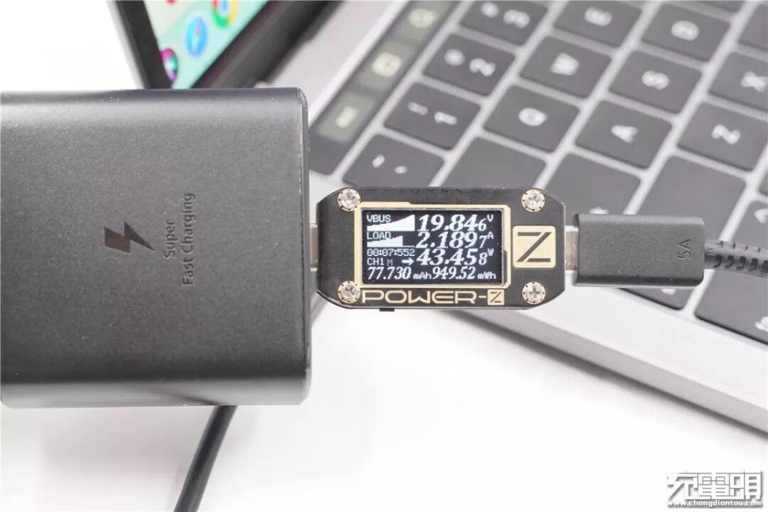 充MacBook Pro 13,电压19.84V,电流2.18A,功率43.45W,顺利握手PD快充。