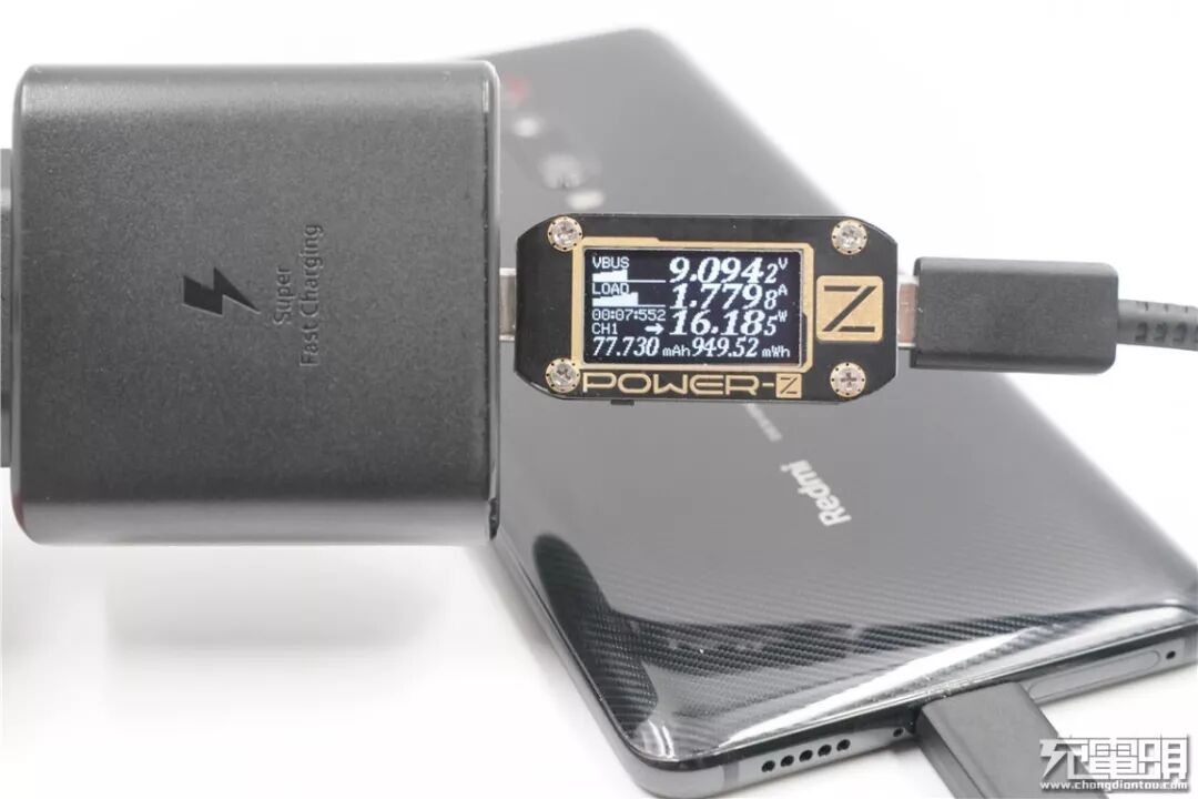 Redmi K20 Pro,电压9.09V,电流1.77A,功率16.18W,顺利开启PD快充。