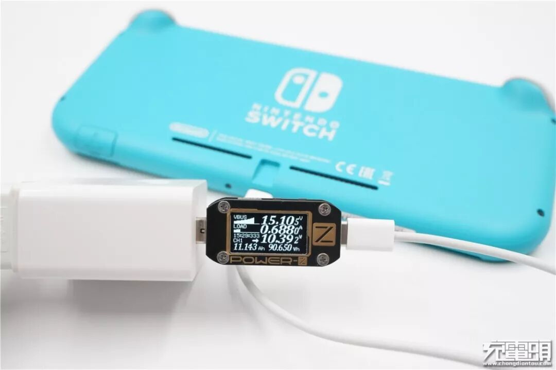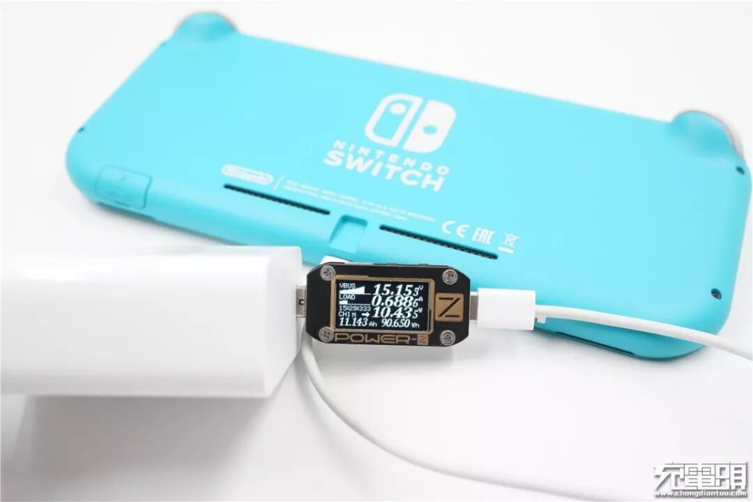 使用MI小米 单口90W PD ADC90TM充电器为Switch Lite充电,电压15.15V,电流0.68A,功率10.43W,开启PD快充。