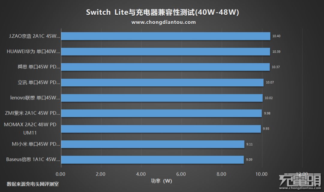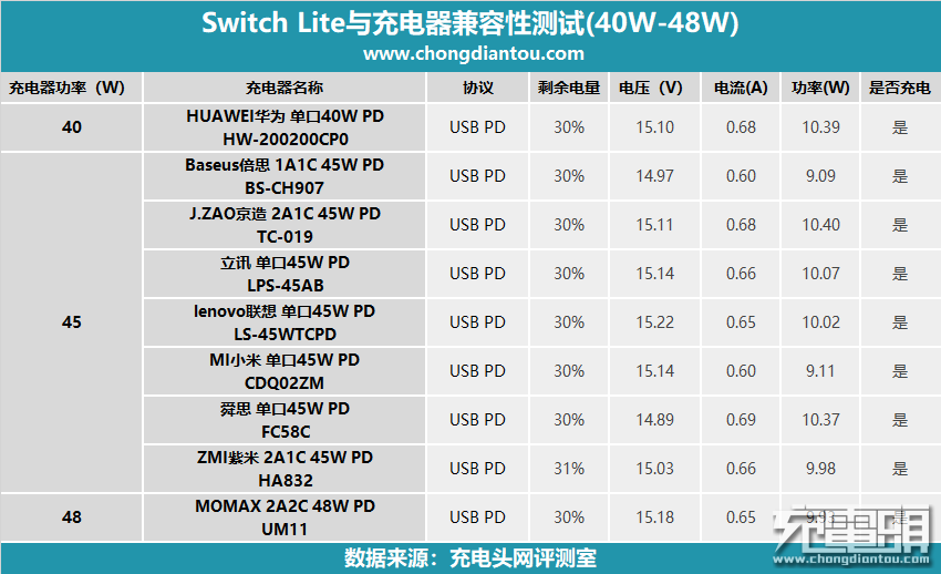以上就是Switch Lite与40W-48W PD充电器兼容性所有测试数据,所有充电器均通过测试,正常为游戏机充电,充电功率都在9W至10W左右。
