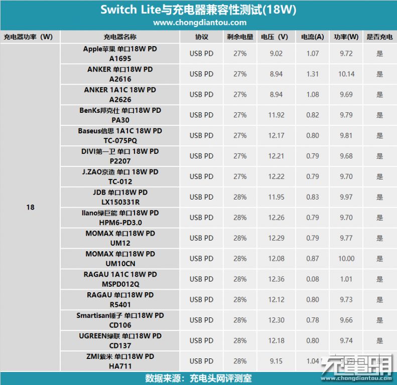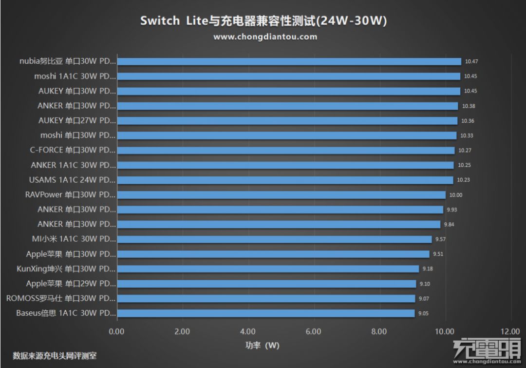 以上就是Switch Lite与24W-30W PD充电器兼容性所有测试数据,所有充电器均通过测试,正常为游戏机充电,充电功率都在9W至10W左右。