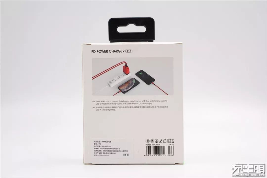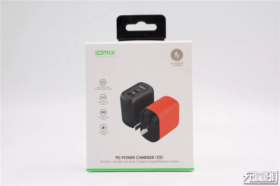 IDMIX 1A1C PD充电器的包装盒延续了品牌的一贯设计,白色纸盒带有挂钩方便实体店展示。正面的产品的实物图和左侧产品四大特点非常显眼,消费者一拿到产品就能知晓其特色。
