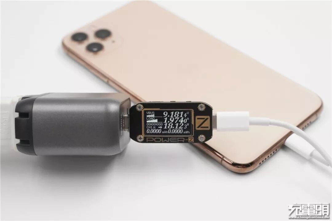 使用充电器USB-C口充iPhone 11 Pro Max,电压9.18V,电流1.97A,功率18.12W,开启PD快充。