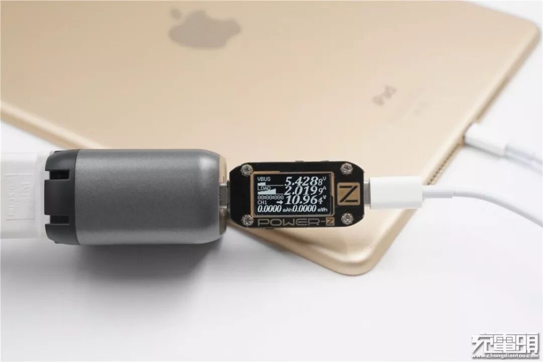 充iPad Air2,电压5.42V,电流2.01A,功率10.96W,开启Apple 2.1A充电模式。