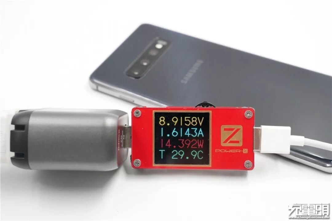 充三星S10+,电压8.91V,电流1.61A,功率14.39W,开启AFC快充。