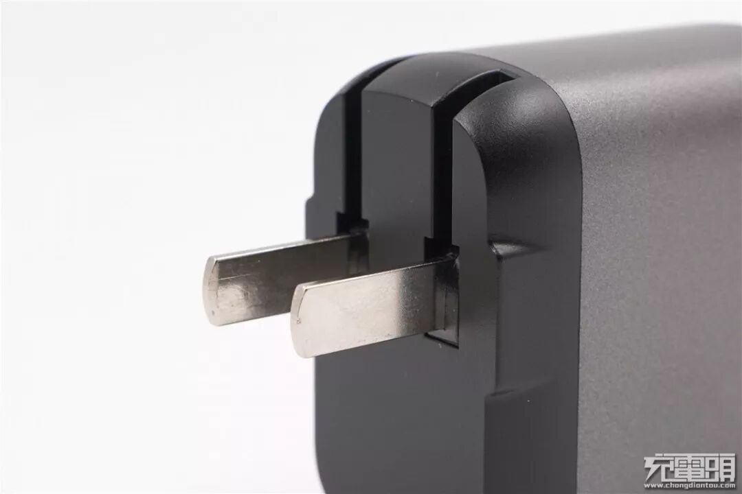 充电器采用可折叠插脚设计,便于收纳携带。插脚两侧还设计了支撑结构,插在插座上时将会更加稳定。