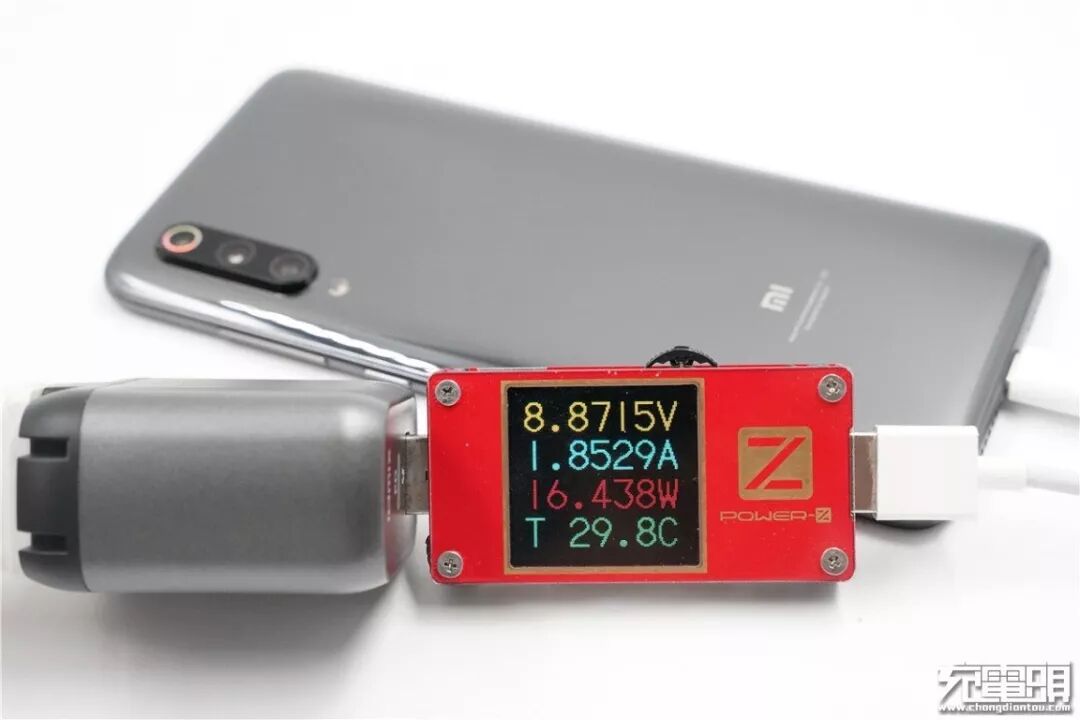 充小米9,电压8.87V,电流1.85A,功率16.43W,开启QC快充。