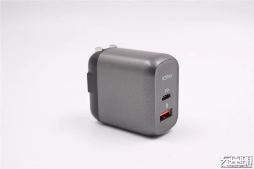 插脚对立面是充电器的输出端面,端面上方印制“IDMIX ”。充电器共有USB-A、USB-C两个输出接口,USB-C接口上有PD字样,代表该口支持PD快充,USB-A口上方有闪电标志,USB-A舌片为橙色。