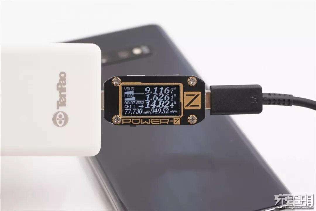 充三星S10+,电压9.11V,电流1.62A,功率14.82W,顺利握手PD快充。