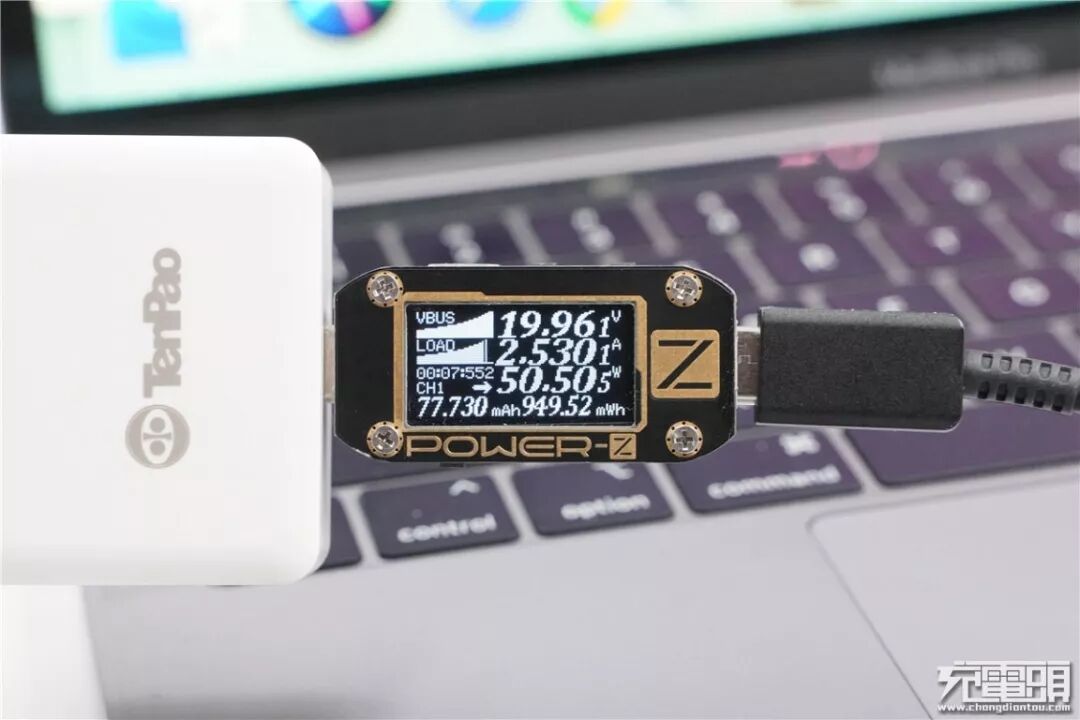 充MacBook Pro 13,电压19.96V,电流2.53A,功率50.50W,顺利握手PD快充。