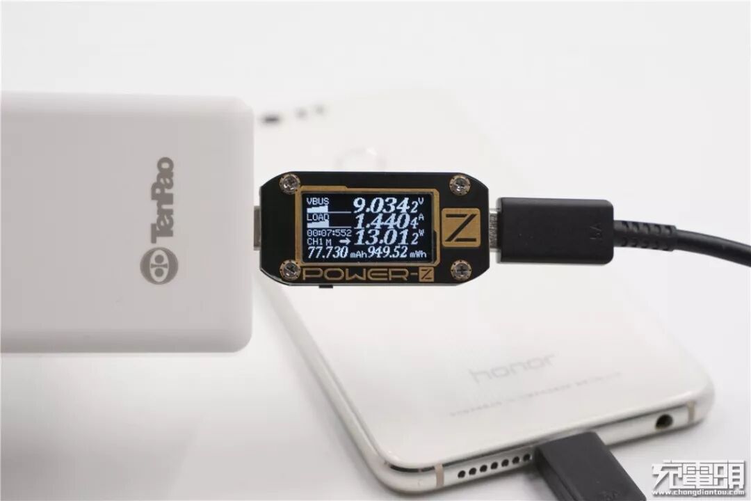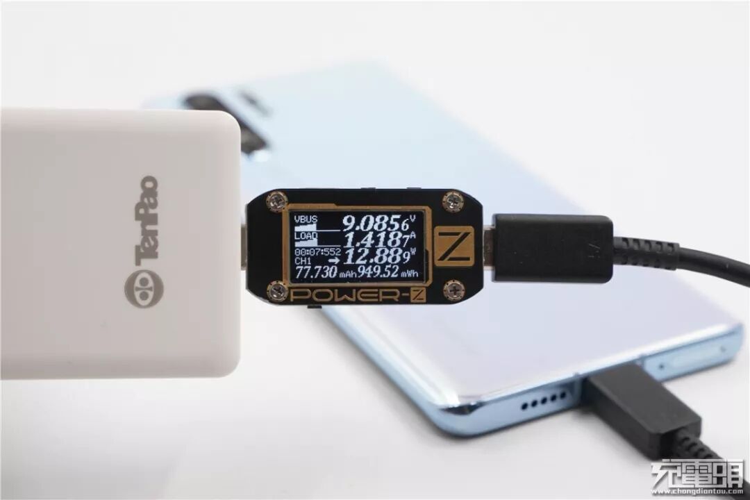 充华为P30 Pro,电压9.08V,电流1.41A,功率12.88W,顺利握手PD快充。