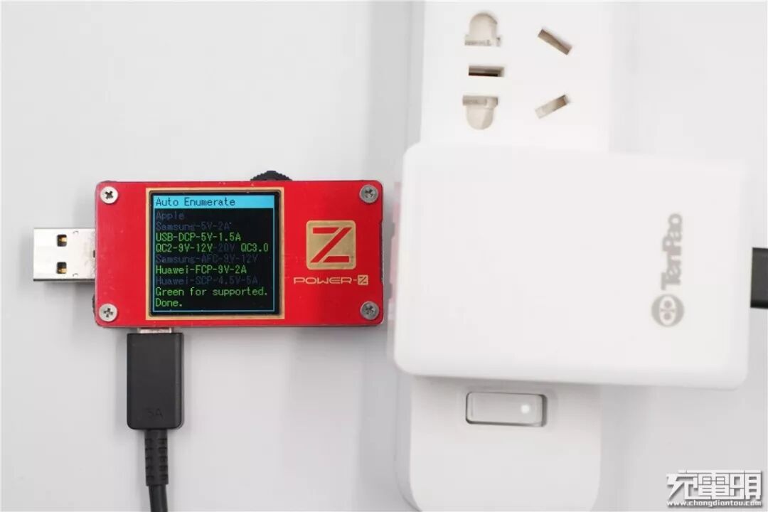 使用Power-Z KT001测试仪对天宝集团65W氮化镓充电器进行协议检测,该充电器支持QC、FCP充电协议。