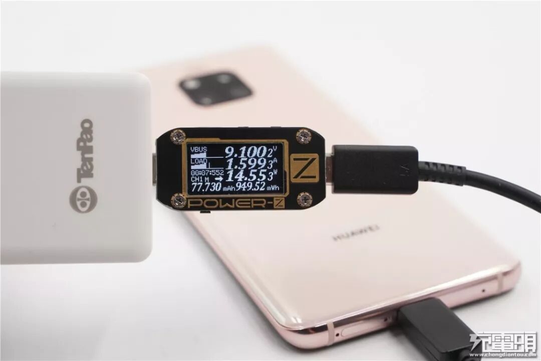充华为Mate20 Pro,电压9.10V,电流1.59A,功率14.55W,顺利握手PD快充。