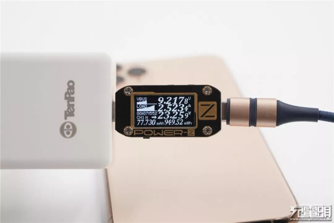 使用天宝集团65W氮化镓充电器充iPhone 11 Pro Max,电压9.21V,电流2.52A,功率23.25W,顺利握手PD快充。